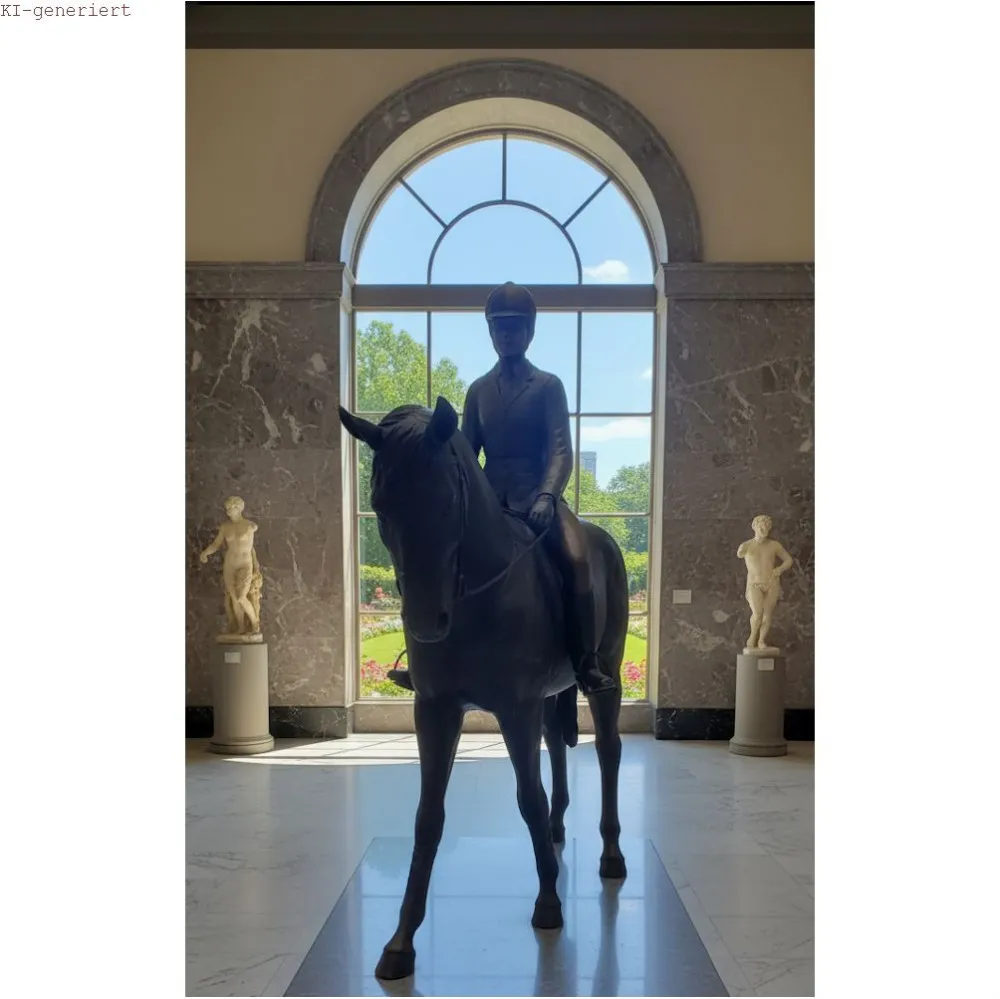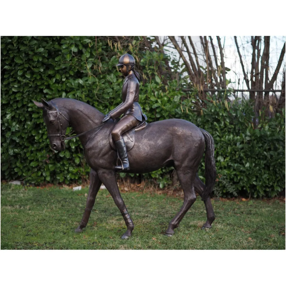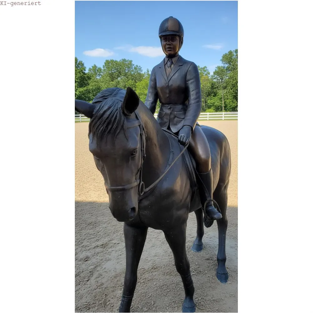 Diese Bronze-Figur Pferd in Lebensgröße mit Reiter ist ein echter Hingucker für Ihren Garten.