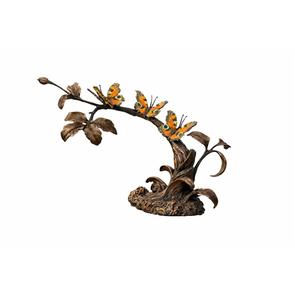 Diese dekorative Skulptur zeigt mehrere filigrane Schmetterlinge aus Bronze, die auf einem kunstvoll gestalteten Ast sitzen. Die detailreiche Verarbeitung der Flügel und die warme Bronzeoptik verleihen dem Kunstobjekt eine elegante und natürliche Ausstrahlung.