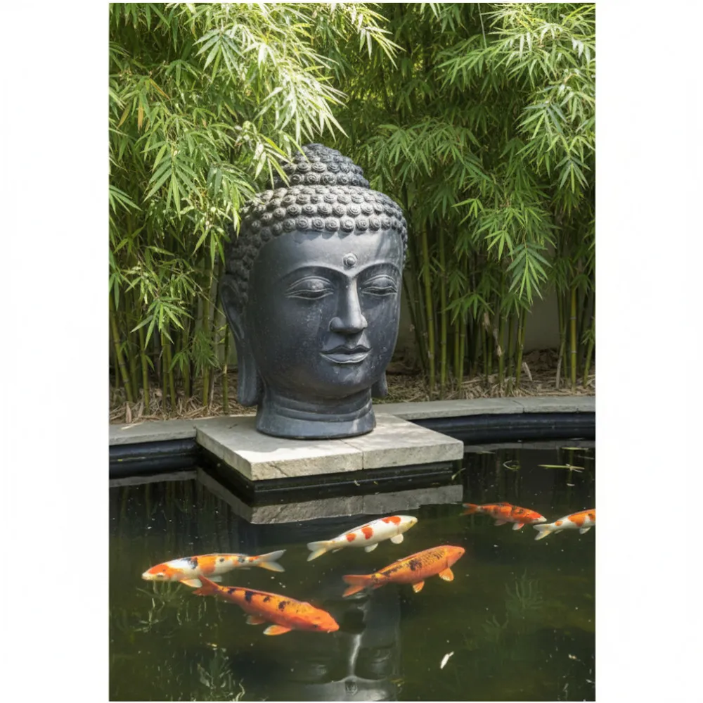 Dieser stilvolle Buddha-Kopf aus hochwertigem Steinguss ist ein ausdrucksstarkes Dekorationselement für den Koi-Teich und asiatisch gestaltete Gartenbereiche. Der ruhige, in sich gekehrte Gesichtsausdruck strahlt Gelassenheit, Achtsamkeit und Harmonie aus und unterstreicht die entspannende Wirkung des Wassers.