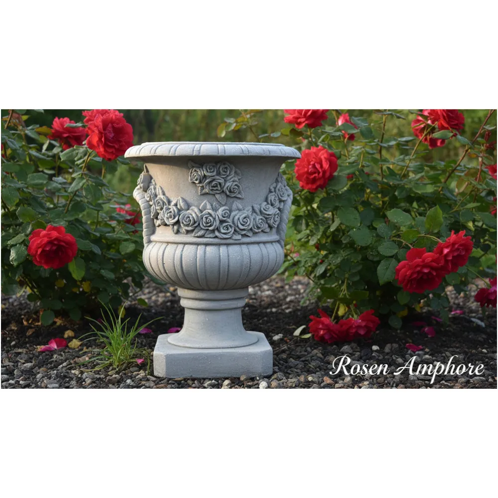 Um eine Rosenamphore in witterungsfestem und frostsicherem Steinguss. Sie ist ein deutliches optisches Upgrade zu einem einfachen Pflanztopf oder Blumentopf.