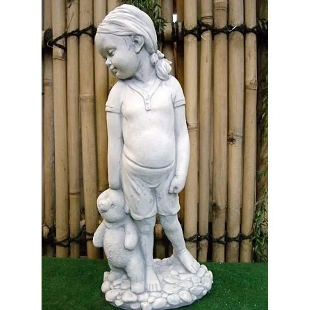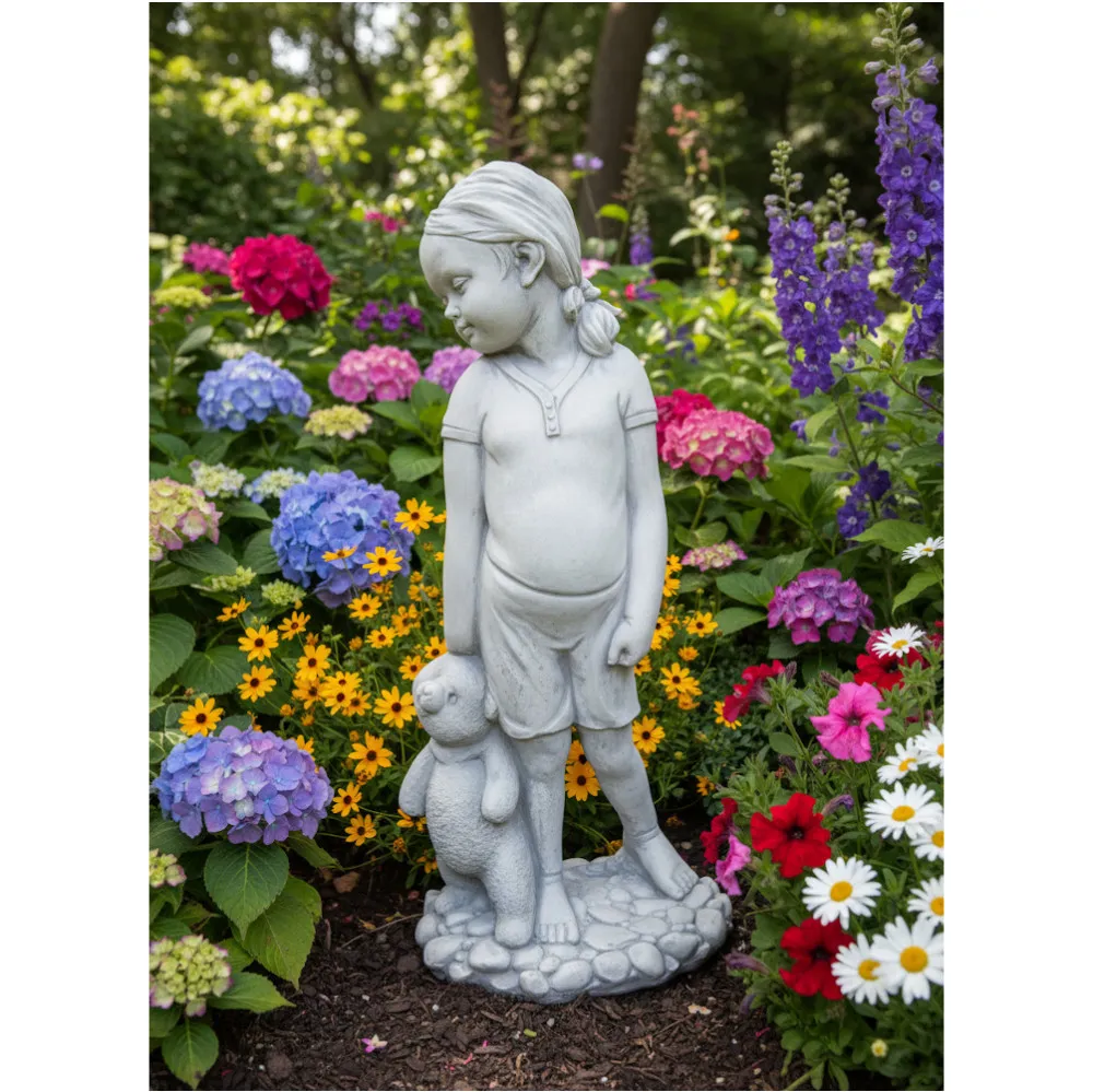 Diese bezaubernde Gartenfigur zeigt ein Mädchen, das liebevoll einen Teddy an der Hand hält. Die kindliche Unbeschwertheit und die detailreiche Ausarbeitung verleihen der Figur eine besonders herzliche und nostalgische Ausstrahlung. Sie ist ein dekorativer Blickfang und bringt eine warme, emotionale Note in jeden Garten- oder Außenbereich.