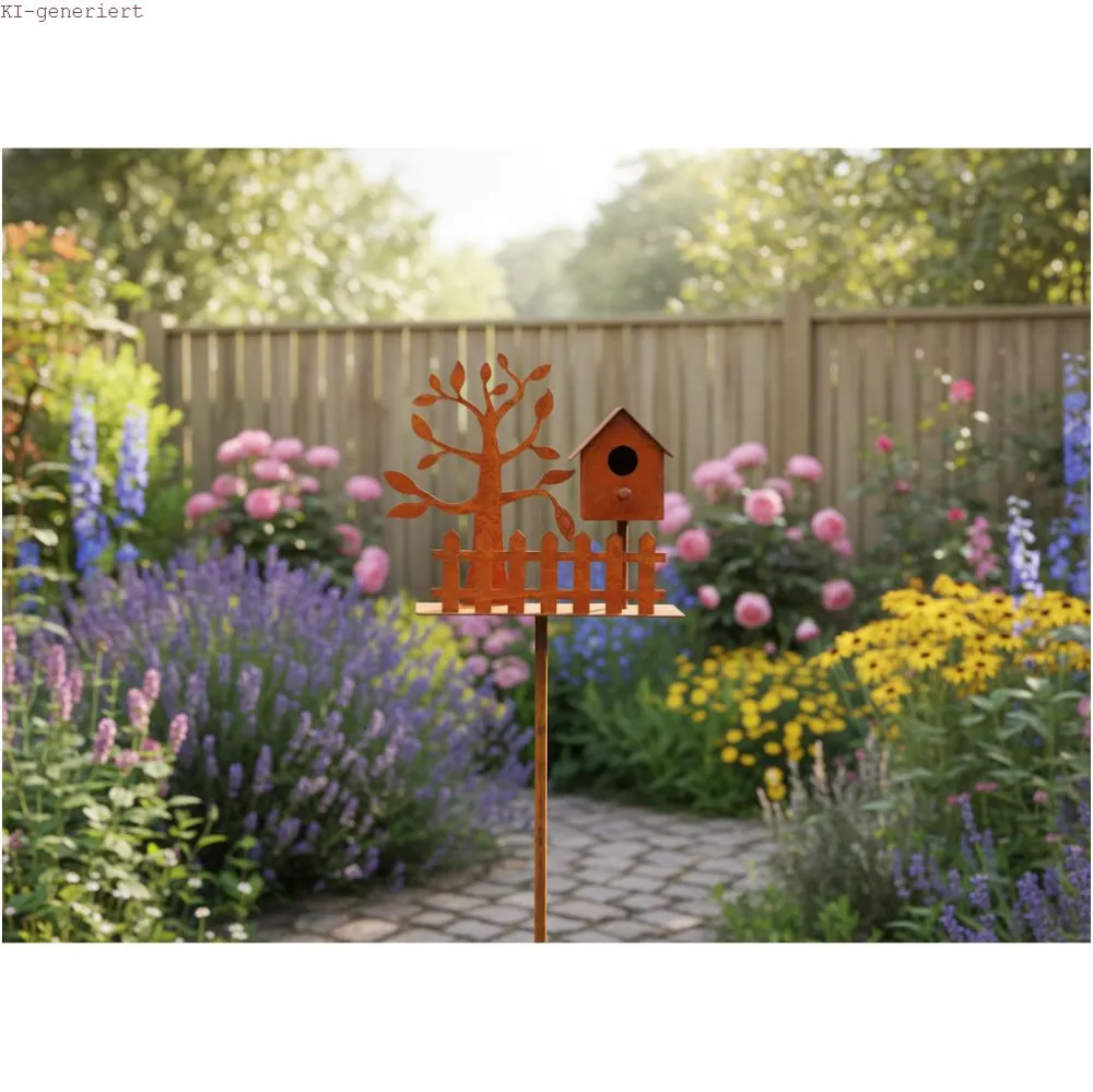 Die charakteristische Rostpatina entsteht durch eine spezielle Behandlung des Metalls und verleiht jedem Stück einen individuellen und einzigartigen Charakter. Dadurch passt das Vogelhaus besonders gut zu naturnahen, ländlichen oder modernen Gartengestaltungen.
