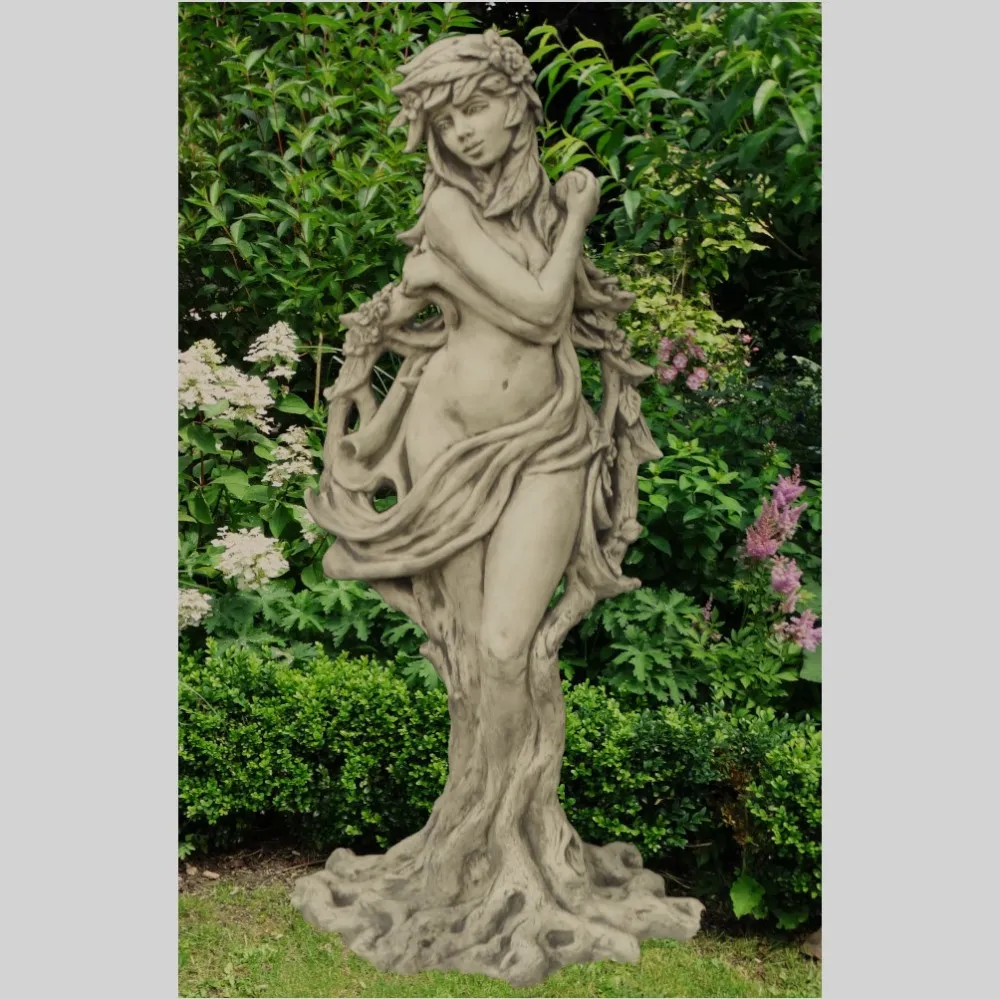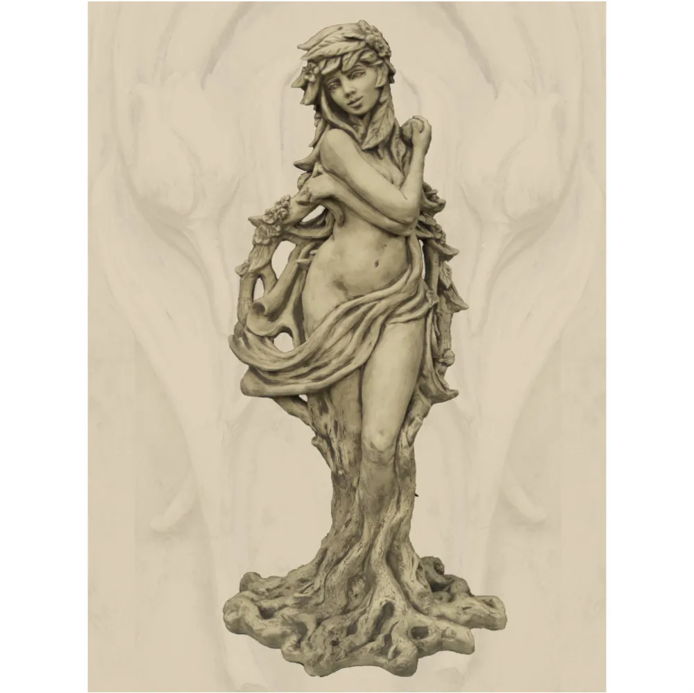 Die Baumhüterin Gaia ist detailreich gearbeitet: Aus ihrem Körper erwächst die Natur selbst – Blätter, Ranken und Wurzeln verschmelzen harmonisch mit ihren anmutigen Formen. Gefertigt aus hochwertigem Steinguss, ist die Statue frost- und witterungsbeständig, wodurch sie das ganze Jahr über im Freien stehen kann.